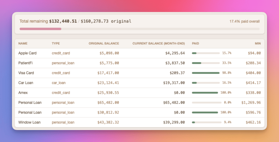 Right now, our focus is on the Apple Card at 15.24% interest, followed by our PatientFi loan at 0% interest. Once that's gone, everything that was going to it rolls into the big interest card - adding $481.50 to our snowball by summer!